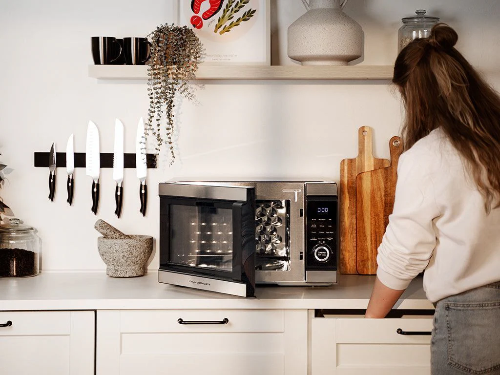 De ONYX COOKWARE⢠COMBI-OVEN MET AIRFRYER is ongelooflijk eenvoudig te gebruiken, waardoor koken eenvoudig en leuk wordt. Het heeft een helder digitaal scherm dat alle instellingen duidelijk weergeeft, zodat je precies kunt zien wat je aan het aanpassen bent zonder enige verwarring. De knoppen zijn eenvoudig en intuïtief - zelfs als je nog nooit een keukenapparaat hebt gebruikt, zul je het eenvoudig vinden om te bedienen.